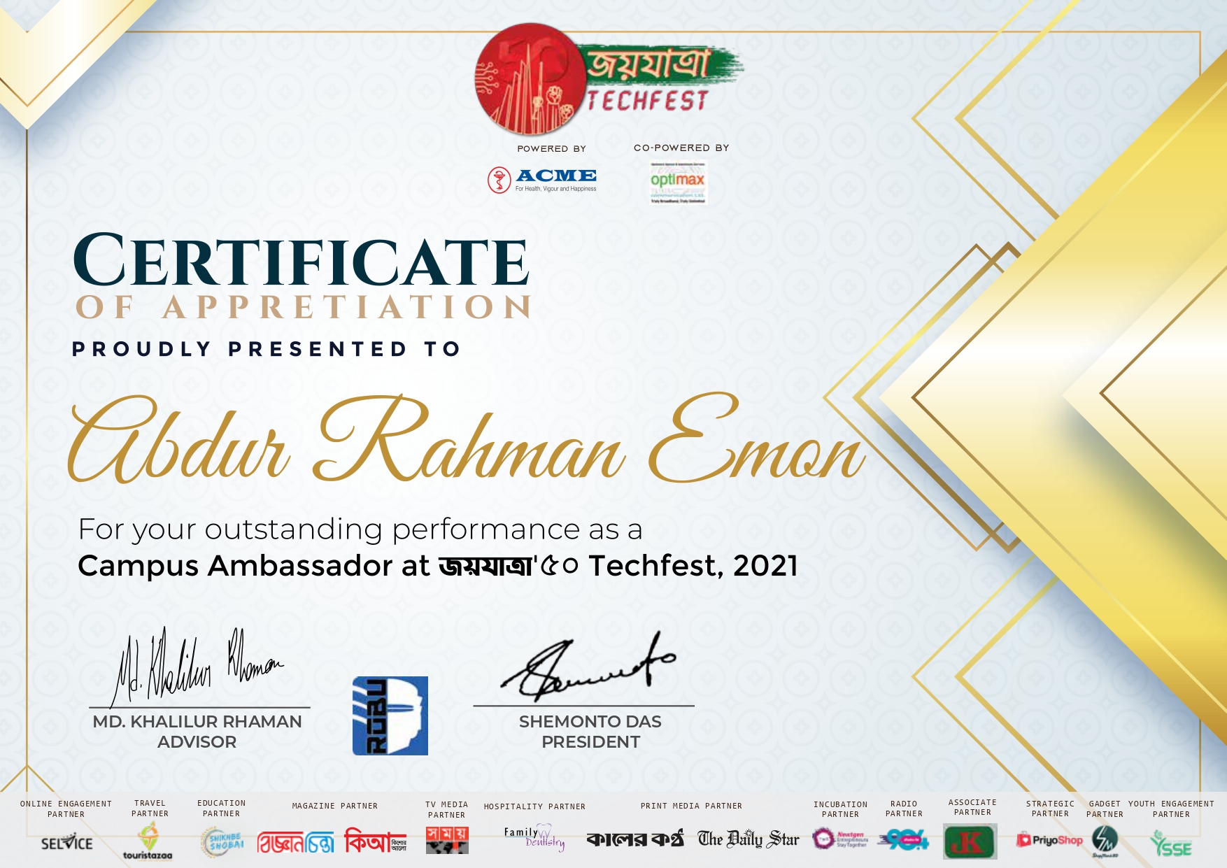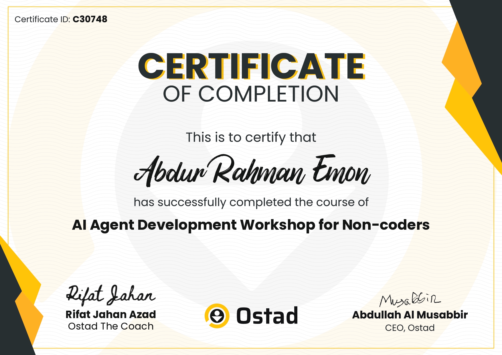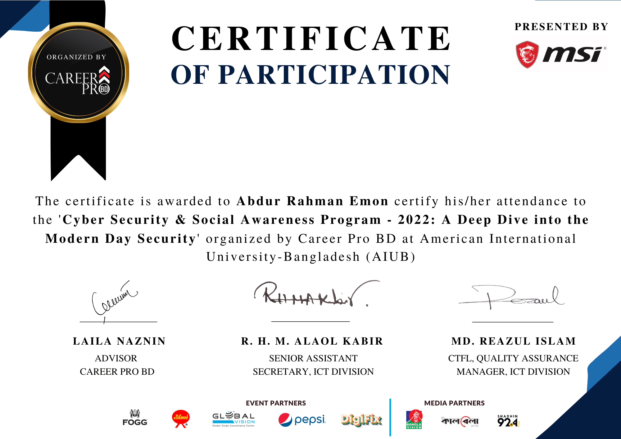 Achievements scroll to continue AllAcademicsExtra Curricular ActivitiesCoursesSummits & ConferencesOthers Dr. Anwarul Abedin Leadership Award at 21st Convocation of AIUB AI & Agility: A Comprehensive Introduction - Scrum Alliance Scrum Fundamentals Certified (SFC™) - SCRUMStudy Introduction to Generative AI: Art of the Possible - AWS Lead Like an Agilist: Time, Teams & Transformation - Startise PMI Certified Professional in Managing AI (PMI-CPMAI)™ - Project Management Institute Product-Led Fundamentals - ProductLed AI for Product Management - Pendo.io Google Cloud Security Summit 2025 Product Analytics Certification - Pendo.io Product Management Bootcamp - unbolt Academy AI Agent Development Workshop - Ostad AWS Summit 2025 (India) Next.js CONF 2023 Product Management - Great Learning Product Life Cycle Management - Great Learning Project Management - Great Learning Product Management 101 - Simplilearn Artificial Intelligence Micro-Certification - Product School PMP Certification: Project Management 101 - Simplilearn Art of Job Searching & Applications - Bohubrihi Product-Led Growth Micro-Certification - Product School Best Student Performance Award 2015 (SSC) - BSB Foundation Best Student Performance Award 2012 (JSC) - BSB Foundation Certificate of Excellence Award 2012 (JSC) - Panjeree AIUB Cyber Gaming Fest 2022 Jarvis 4.0 NASA International Space Apps Challenge 2023 Digital Bangladesh Mela 2023 International Conference on Computing Advancements 2020 NASA International Space Apps Challenge 2022 AIUB Cyber Gaming Fest 2019 Cyber Security & Social Awareness Program 2022 JoyJatra Tech Fest 2021 HUAWEI The Future of Mobile App Industry BUP Techsurgence 2019 YWCA 3rd Inter School Debate Competition 2010 MGBSDC Debate Competition and Workshop 2010 Fine Arts Competition 2007 NBPSC Poetry Competion 2007